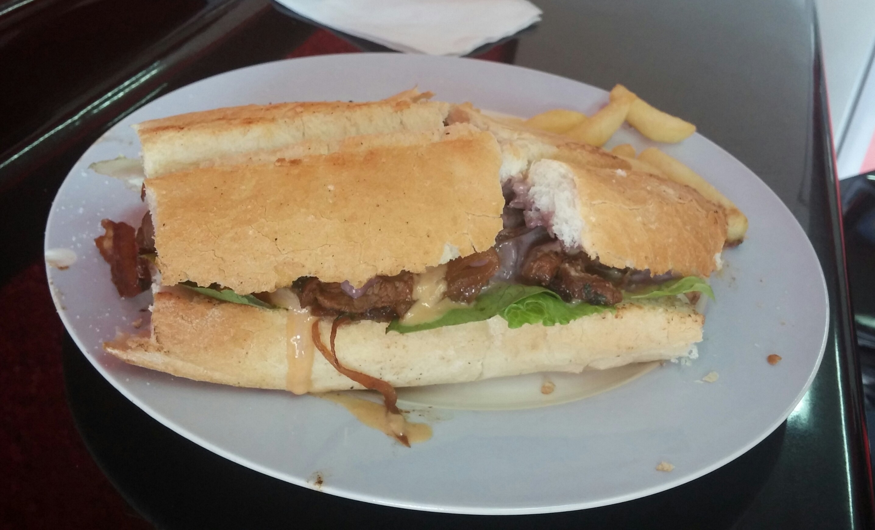 Llega al mesón un sánguche en una marraqueta entera (sí, las dos completas), acompañado de papas fritas, y con un jugo de maracuyá, porque había que probar esos maravillosos jugos curativos. Como buen sánguche grande, costaba elegir por dónde atacarlo con el tenedor y cuchillo, así que el primer mordisco fue entonces solo pan, con algo de verduras y untado generoso en los jugos propios del salteado y de las salsas elegidas. Fue amor a primer bocado.
