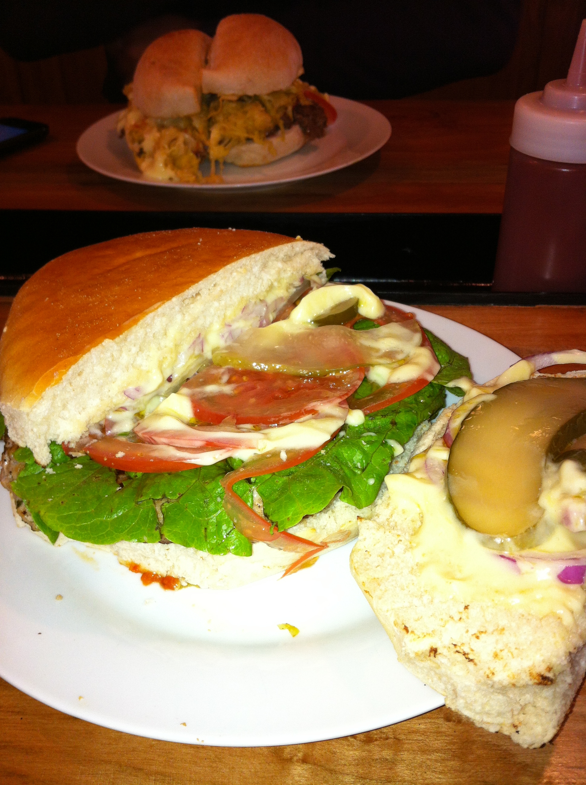 De todas, mi hamburguesa favorita es El Zapata; ni tan grande ni parecido a algo miserable. Lleva queso oaxaca asado (un quesillo que se desenhebra), tomate, lechuga, cebolla al grill, hamburguesa (que puedes elegir qué tan cocida la quieres) y aderezo de cilantro (yogurt, cilantro y pimienta). Realmente maravillosa.