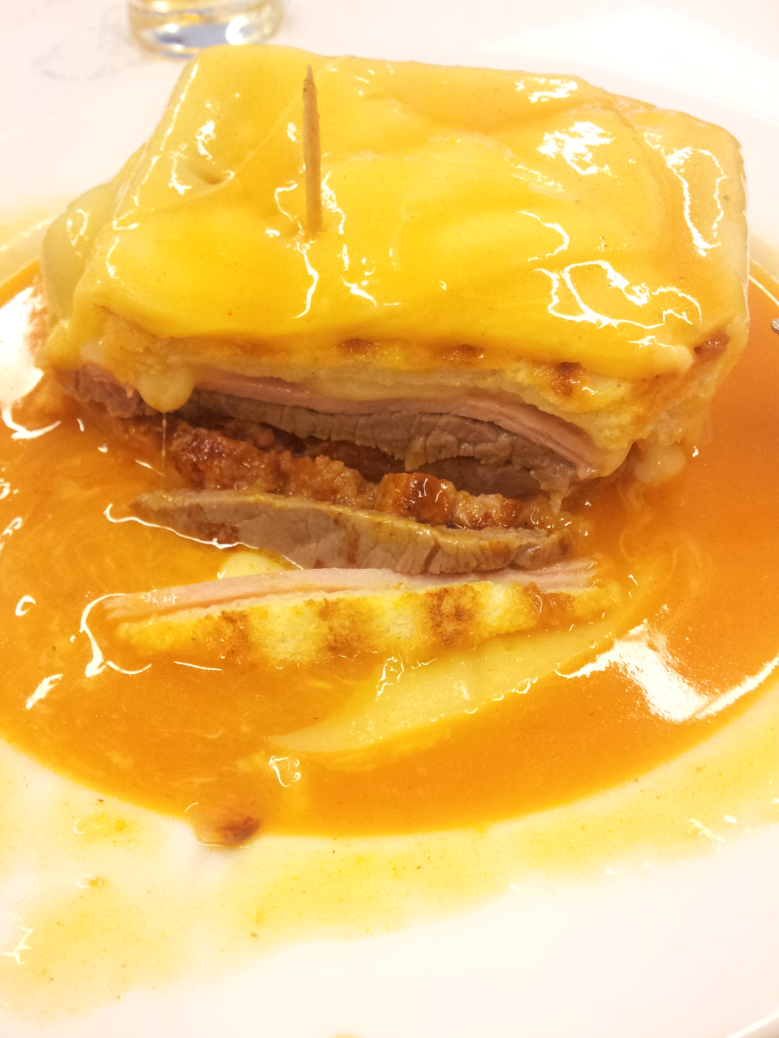 Recetas para replicar la francesinha del Café Santiago puede haber muchas, pero este parece ser un plato muy sensible a los detalles: al pão de forma (pan de molde) se le quitan los bordes y se tuesta previamente de manera de conseguir una consistencia firme para servir como estructura de soporte de todo lo que se le viene encima; el jamón y el chouriço (algo a medio camino entre una longaniza y una butifarra), que va abierto en cortes longitudinales, deben ser de muy buena calidad y gran sabor; la carne de vacuno es tierna y sabrosa, probablemente picanha (punta de ganso) asada, cortada en láminas delgadas; el queso es fundamental, se usa una variedad de queso local, de sabor profundo y una envidiable capacidad de derretirse sin desparramarse; y para qué hablar del molho en base a tomate y cerveza con que se baña finalmente toda la preparación, muy sabroso y con el suficiente picor como para producir una fiesta en el paladar. Con todos esos estímulos aglutinados en la forma de un sánguche con vocación de lasaña, uno sale de aquí rodando y con las endorfinas totalmente revueltas, pero sobre todo con la seguridad de que hay que volver.