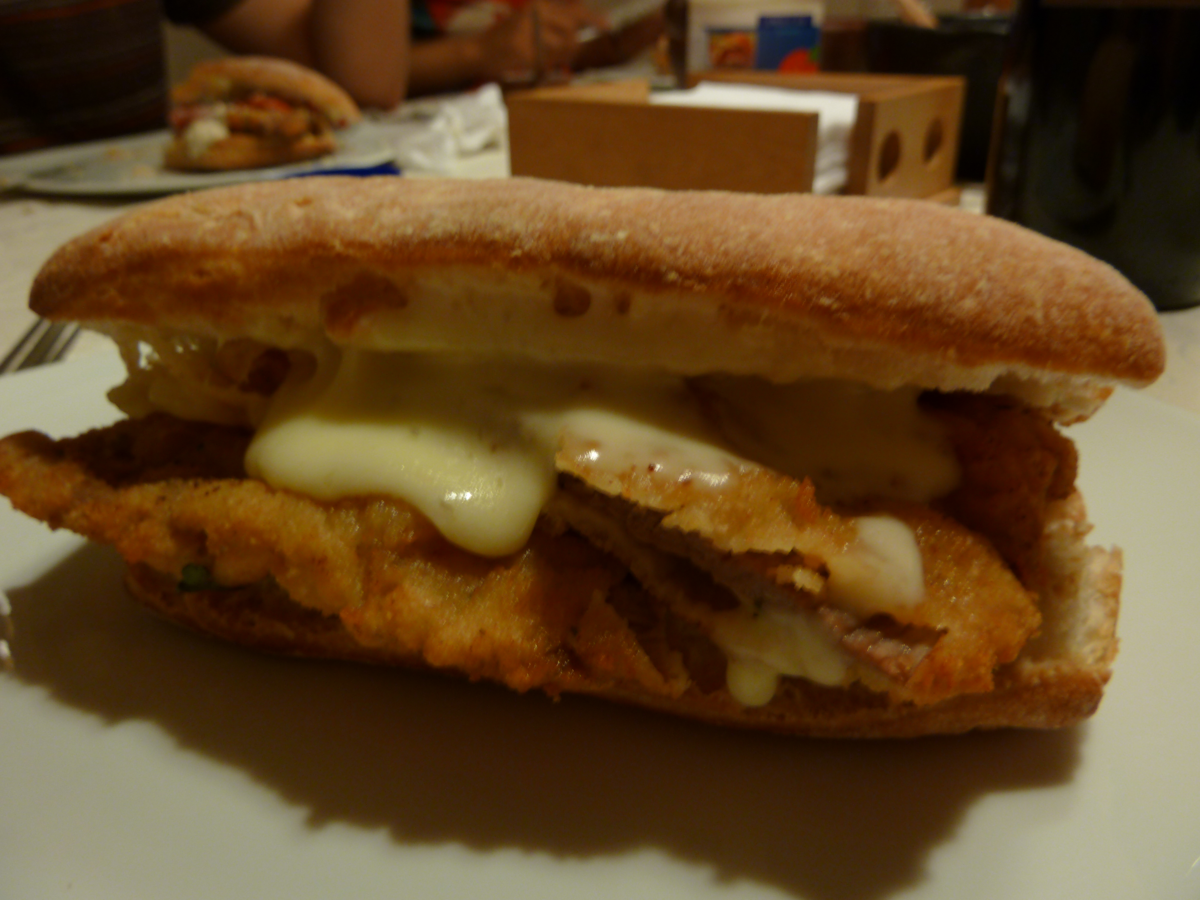 Luego, pasamos un par de lonjitas de queso mantecoso (comprado acá) por la plancha y dispusimos las cosas dentro de un pan chabata calentito en el siguiente orden: la milanesa cortada en dos cuadrados, evitando así que a la primera mascada saliera volando todo y se desarmara el Barros Bielsa, el quesito fundido encima, asomándose coquetamente hacia fuera. Vea: